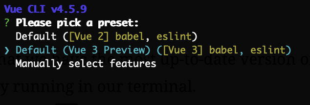 If we successfully updated our CLI, we should have an option to choose Vue 3.