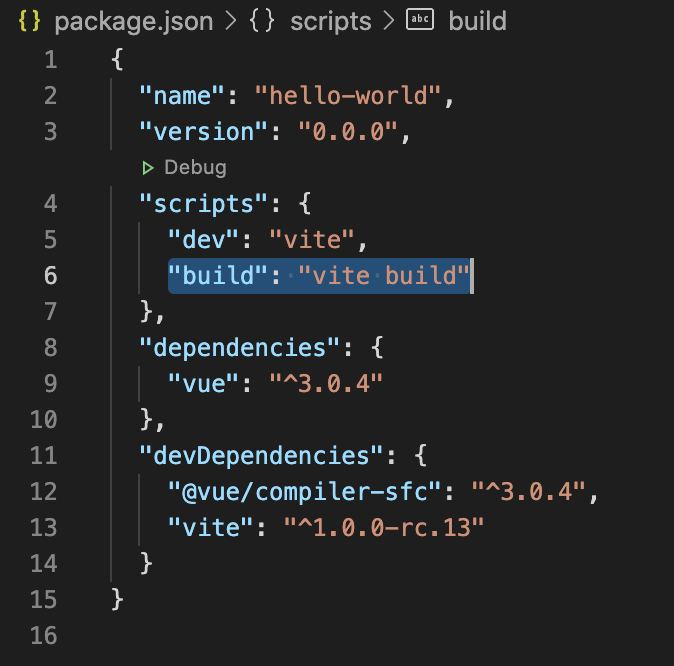 If we look at package.json, we see that this is calling vite build – which like other build processes, will bundle your Vue project and prepare your dist folder to be served.