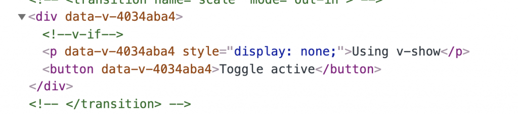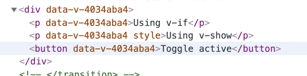 As you can see, with v-if, the conditional block is completely removed from the DOM. But with v-show, it’s display is set to none.