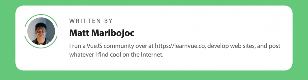bio: 'I run a VueJS community over at https://learnvue.co, develop web sites, and post whatever I find cool on the Internet.',