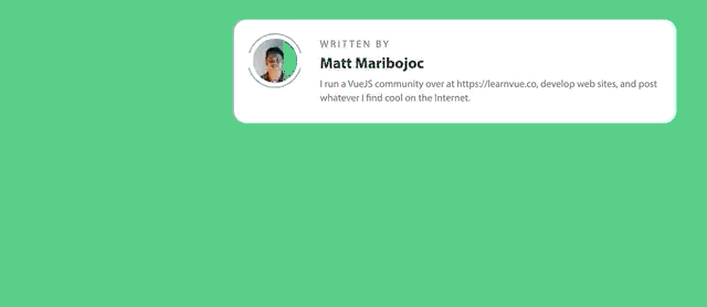 For this example, I’ve recreated the Medium author section using an asynchronous component, a skeleton loader, and Vue’s new suspense components.