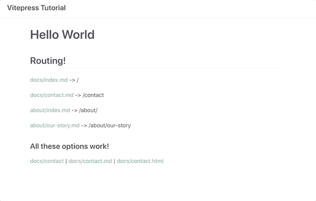 In our markdown files, we have three ways of linking to routes. We can either use the base url, add .md or .html – all will properly link to the right component.